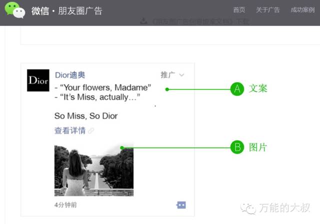 大叔認(rèn)為這是關(guān)鍵步驟,因?yàn)橹苯雍推放圃谂笥讶Φ膹V告展示效果掛鉤。微信官方的圖示說明,朋友圈廣告分為3個(gè)部分:文字、圖片和詳情頁。