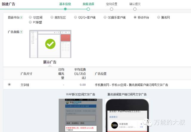 綜上所述,整個(gè)申請(qǐng)過程很詳細(xì),大叔發(fā)現(xiàn)只有一個(gè)問題遺漏了,就是朋友圈廣告是如何定價(jià)的?另,廣告主怎么付費(fèi)呢?大叔專門登陸了廣點(diǎn)通平臺(tái),發(fā)現(xiàn)涉及到微信的廣告位只有“微信訂閱號(hào)文字廣告”,并沒有“朋友圈廣告”(如下圖),也就是說,朋友圈廣告的投放并不在廣點(diǎn)通。