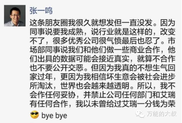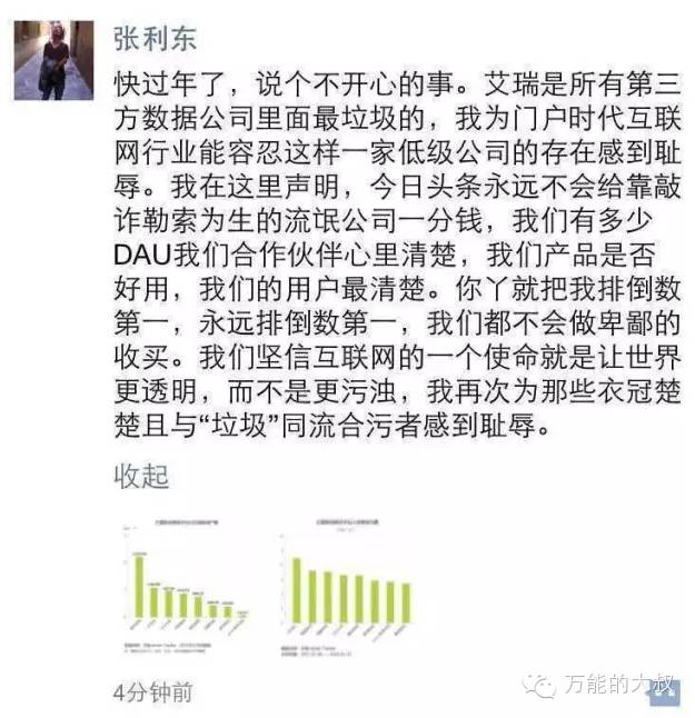 同時,今日頭條合伙人張利東也發朋友圈稱號“艾瑞是所有第三方數據公司里面最垃圾的,我為門戶時代互聯網行業能容忍這樣一家低級公司的存在感到恥辱。”
