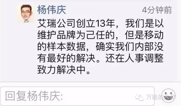 對于今日頭條三位高管的炮轟,艾瑞總經理楊偉慶也通過朋友圈回應此事:“今日頭條對艾瑞的所有建議不理睬,發生如此事件,非常遺憾的看到一個企業管理者如此言行。”而楊在微信朋友圈的評論中稱:“移動樣本的數據確實內部沒有最好的解決,還在人事調整解決中”。(截屏分別來自“趙宏民”和“互聯網第一獵”)