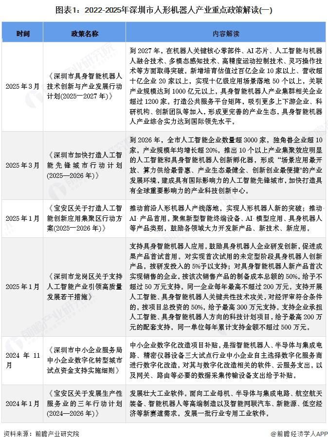 截至 2025 年 3 月,深圳市寶安區、南山區、福田區、龍華區等區域均圍繞人形機器人出臺了一系列產業政策,通過資金補貼、活動補貼、技術研發獎勵、建設公共服務平臺等方式,推動人形機器人產業發展。