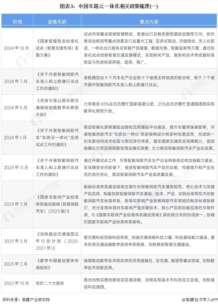 近年來,中國相繼出臺了多項政策,重點支持 " 車路云一體化 " 發展,涵蓋 " 汽車強國 "、" 交通強國 " 和 " 數字中國 " 等領域。2023-2024 年,隨著幾份重要文件的發布,車路云一體化進入全面統籌和大規模落地建設階段,智能交通被確立為 " 新基建 " 的核心支柱。政策支持主要集中在加快車聯網基礎設施建設、推動車聯網技術的商業化應用以及促進 5G、V2X 等前沿技術的研發與應用,同時加強信息安全保障措施,推動產業快速發展。