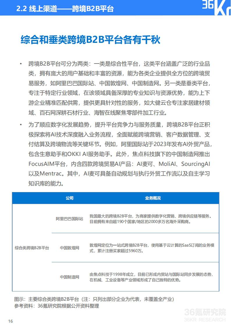 經過多年深耕,我國跨境 B2B 產業已構建起覆蓋供應商、采購商及渠道服務商的全鏈路生態體系。在全球化重構、數字技術應用推動下,三方協同重塑貿易價值:供應商借助精準需求預測對接全球采購;采購商通過數據中臺整合供應鏈資源;渠道商整合支付、物流等模塊形成服務閉環。隨著 AI 匹配算法等技術的深度應用,一場以供需雙側及渠道深度智能化升級為特征的跨境 B2B 產業變革正蓬勃興起。