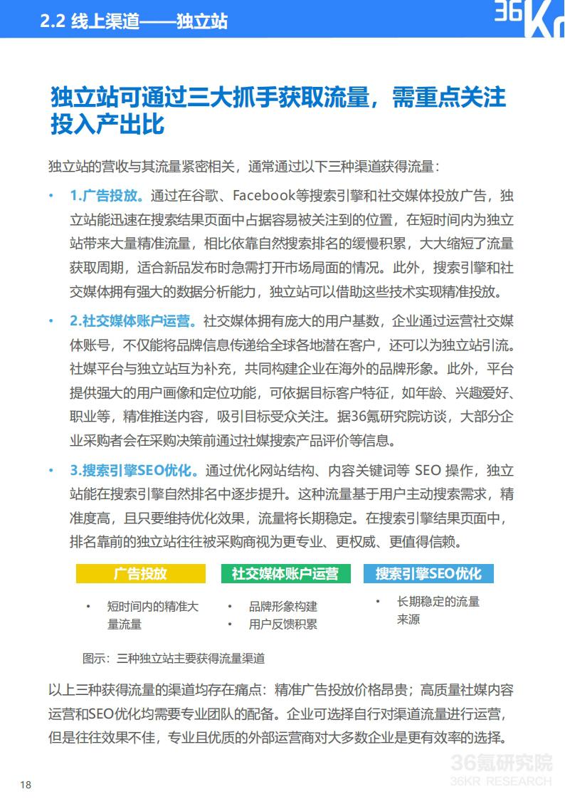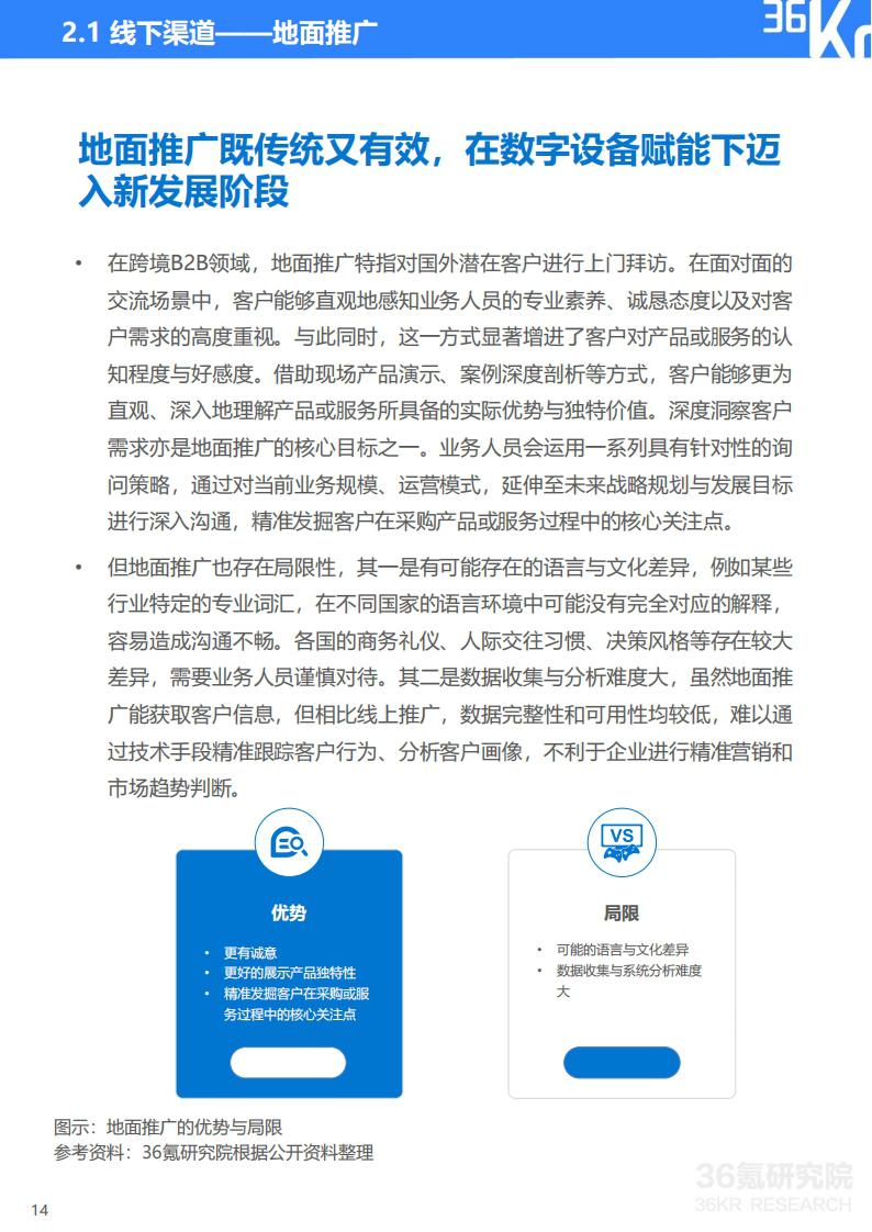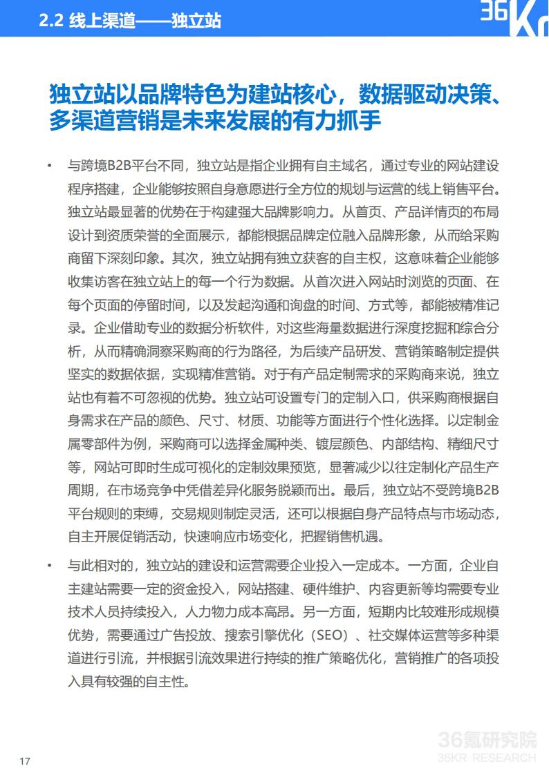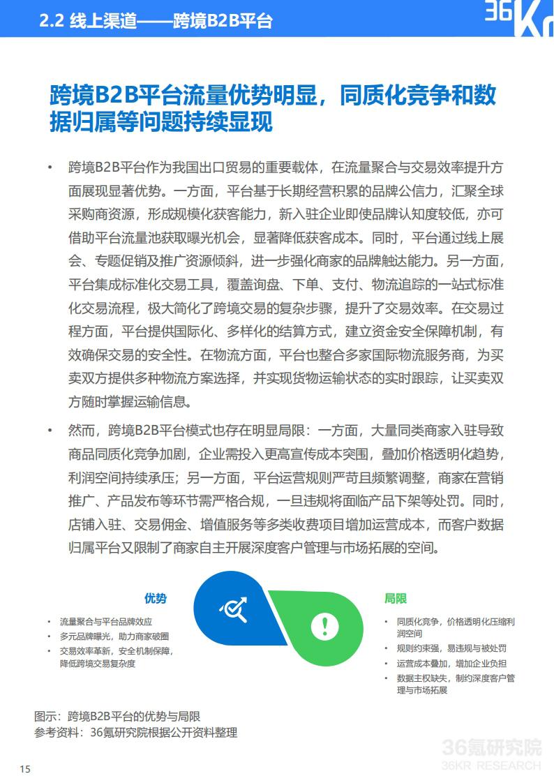 展會與地面推廣因技術革新而取得小范圍進步,行業規模穩步增長。B 端采購行為線上化趨勢明顯,跨境 B2B 貿易平臺具有較高成長空間;全球電商去中心化趨勢崛起,獨立站模式快速發展。因而,在線上渠道中,跨境 B2B 平臺與獨立站模式各有千秋,并舉發展。