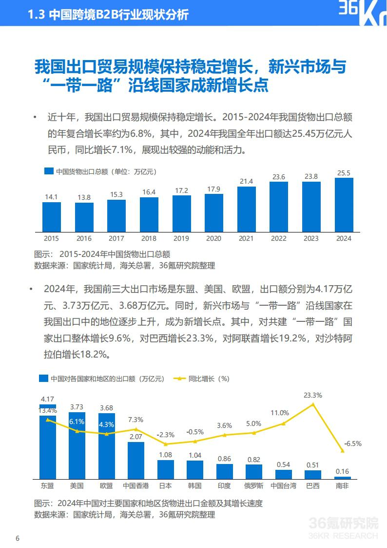 近十年我國出口貿易規模保持穩定增長。2024 年我國全年出口額達 25.45 萬億元人民幣,同比增長 7.1%,展現出較強的動能和活力。新興市場與 " 一帶一路 " 沿線國家在我國出口中的地位逐步上升,成為新增長點。例如,對共建 " 一帶一路 " 國家出口貿易整體增長 9.6%,對巴西增長 23.3%,對阿聯酋增長 19.2%,對沙特增長 18.2%。