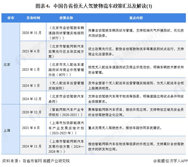 地方政府層面,為了響應國家號召,各省市積極印發有關政策通知推動無人駕駛物流車行業的發展。其中,北京市作為無人駕駛物流車行業的前沿城市,通過完善測試管理、設立政策先行區、規范無人配送車運營等措施,逐步支持自動駕駛物流車的商業化應用。地方政府的相關政策為無人駕駛物流車的技術創新、應用推廣和商業化運營提供了有力支持,推動行業加速發展。截至 2025 年 4 月,各重點省市無人駕駛物流車行業的相關政策匯總如下:
