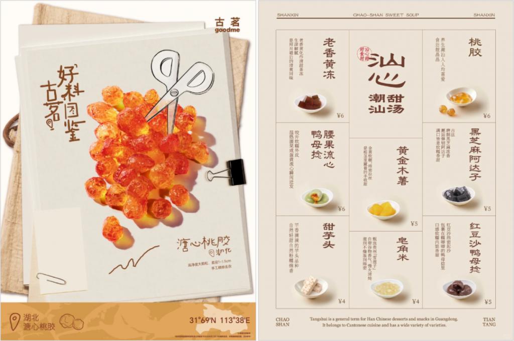 仔細觀察這一批糖水新品牌的菜單,不難發現他們的主打單品不再是芒果、芋圓這類被滿記、鮮芋仙驗證過的傳統甜品食材,取而代之的是木薯、桃膠、銀耳、海石花等更具地域特色、主打天然養生屬性的食材。