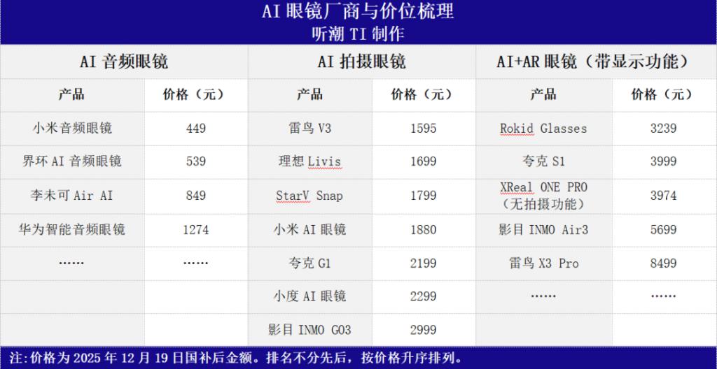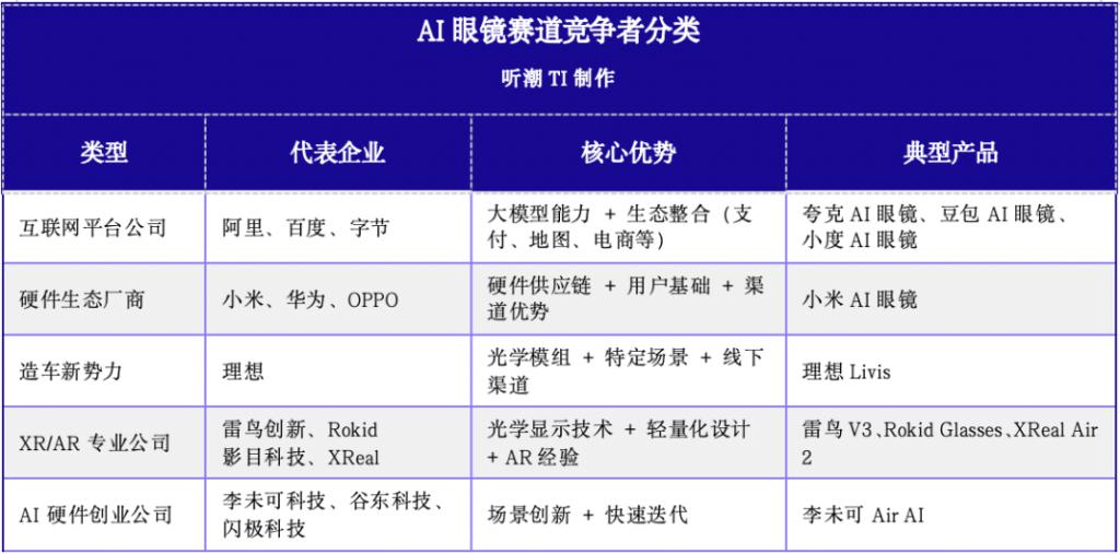 當前市面上的 AI 眼鏡品類繁多,定價跨度極大,從數百元到數千元不等,主要的原因也正是在于產品形態的差異化定位。而在這場混戰中,并非所有玩家都站在同一起跑線。目前國內可清晰劃分為以下五類競爭者: